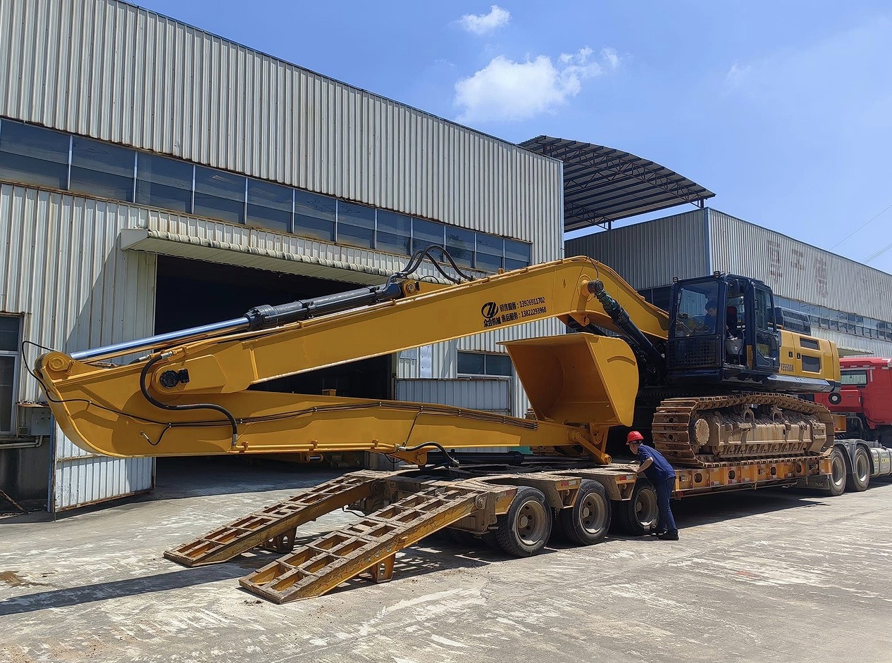 Ο μακρύς βραχίονας εκσκαφέα, γνωστός και ως προέκταση βραχίονα ή εξάρτημα μεγάλης εμβέλειας, είναι μια εξειδικευμένη τροποποίηση σχεδιασμένη για να επεκτείνει σημαντικά το λειτουργικό πεδίο ενός τυπικού εκσκαφέα. Αντικαθιστώντας ή επεκτείνοντας τον αρχικό βραχίονα και το σκέλος, αυτά τα εξαρτήματα επιτρέπουν στα μηχανήματα να επιτύχουν ακτίνες εργασίας που κυμαίνονται από 10 μέτρα έως πάνω από 40 μέτρα, ανάλογα με τη διαμόρφωση. Ο σχεδιασμός συνήθως χρησιμοποιεί χάλυβες χαμηλής περιεκτικότητας σε κράματα υψηλής αντοχής (HSLA), όπως το WELDOX, για να διατηρήσει τη δομική ακεραιότητα, ενώ διαχειρίζεται το βάρος.